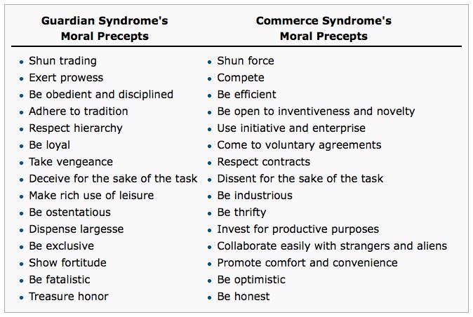 [UPDATE — January 23, 2012: I've added a table about a distinction Jane Jacobs (1992) made between “guardian” and “commercial” syndromes.]
