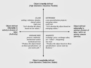 Spinuzzi, a professor of rhetoric and writing who is keenly interested in networks, has lately “been trying to characterize different sorts of activities and particularly how hybrids of those types lead to internal contradictions.” His preliminary typology looks at group activities according to whether an object of activity is defined internally or externally, and tacitly or explicitly. This leads to a two-by-two matrix — thus his typology — about clans, hierarchies, markets, and networks, as presented in the adjoining graphic. He lists seven main sources for this typology, of which five are among those above, including TIMN. As his work develops, he intends to examine hybrids — activities that combine two or more of the four types — with an eye out for “interference patterns and internal contradictions”. [UPDATE — 10/15/14: Spinuzzi’s article, “Toward a typology of activities,” now appears in the Journal of Business and Technical Communications, 2014, as specified here.]