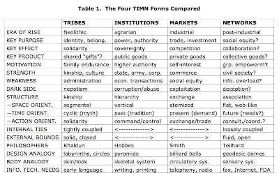 Most such tables are about hierarchies, markets, and/or networks. Some analysts include other forms as well, such as heterarchies, or use other terms, such as peer-to-peer (P2P). Far as I know, mine is the only table that treats tribes as an equally distinct, separate form.